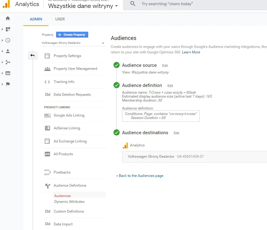Remarketing lists allow us to gather users in an analytical database by grouping them by a specific behavior that you define. Once you define the list of recipients, it begins to gather users who meet the conditions you specify. Remarketing lists can be used in advertising campaigns to target one or more specific user groups. You can create multiple remarketing lists. When defining your remarketing lists, you should consider the option of using them later. If the sale of automotive accessories is an important part of your business, you should consider creating a separate remarketing list to gather users who visited the accessories page or viewed a specific category dedicated to car accessories in your online store. Remarketing lists also require you to define their lifetime. We need to decide how long user data will be stored on it. Depending on the type of business and scale of website traffic, you can decide to store data about users for 1 to 540 days (in the Google Analytics system).