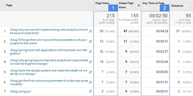 Let’s assume that we run a social profile on Facebook and we want to share on it or sponsor a link; a link to an article on our site that could generate significant interest among users interested in the automotive industry. Without access to analytical data, it would be difficult to determine which of the content on our site may be good for this purpose. We would have to be guided by intuition. To choose the right article based on the data, we should pay attention, first of all, to which publication has the highest recent viewership (no. 1 in the table above). Next, we can check which of the most popular articles is characterized by high user involvement measured by average reading time (no. 2 in the table above). The article that generated a lot of organic interest will probably also have better engagement results on social media than the other publications on our site.