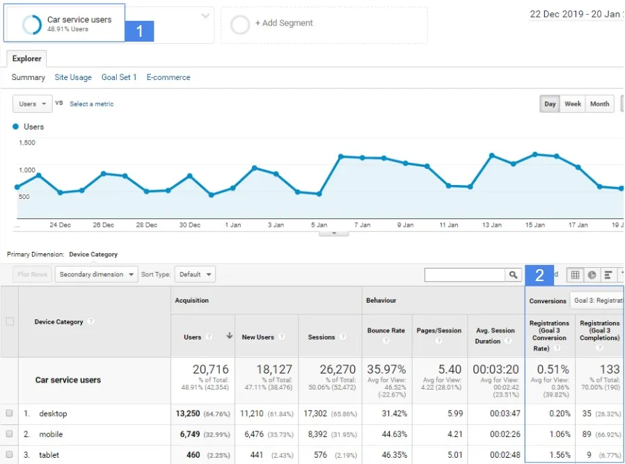 Let’s assume that we want to launch an advertising campaign acquiring new clients for car servicing. We want to see if we can optimize campaign settings by narrowing down the activities or putting emphasis on a specific type of device. Without access to data, we would probably run campaigns optimized for all devices. Conducting a survey among our website’s customers regarding the type of device they used to find our website does not seem to be a good solution. However, if we have access to data from the analytical system, we can easily check which devices performed better so far when it comes to the offer of car servicing. We can achieve this by checking data for the segment of users interested in the service offer (no.1 in the table above). Then we check the conversion rates for the goal defined, for example, as entering the contact tab from the service tab, or completing the service price quote form (no. 2 in the table above). Having knowledge about which user devices perform better for a specific purpose, we can optimize the settings of our campaign relative to those devices.