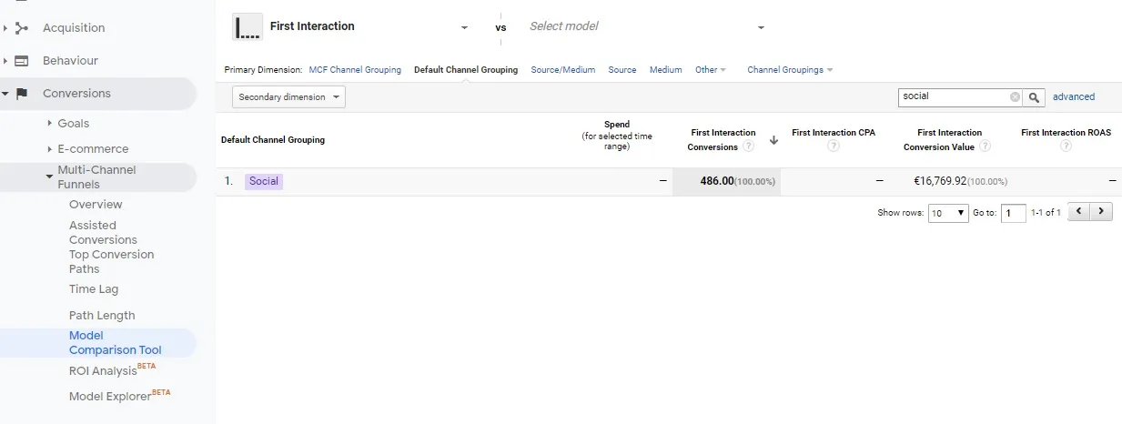 Then, to check where a campaign or social media channel appears on the path, we should use the attribution model comparison report. Looking through the next attribution models, we can come to some interesting conclusions; for example, in the first click attribution a given channel or campaign can get twice as many conversions than in the last click attribution model (as in the screenshot below).