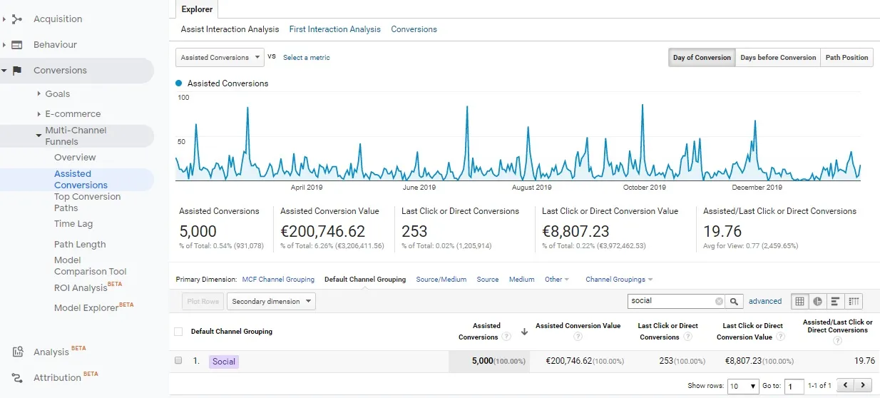 Let’s assume that in recent weeks we have conducted a Facebook campaign acquiring leads on the website. The results visible in standard reports (based on last click non direct attribution) in terms of acquiring new leads are not commensurate with the amount of expenditure incurred for the campaign. The first step should be to check in the Assisted Conversions report whether the social media channel or the specific campaign we carried out on that channel does not support more conversions than it generates. It may turn out, as in the screen below, that the campaign conducted by us does not directly generate a large amount of conversions (last click or Direct Conversion Value) but the amount of conversions that it supports (column assisted conversion value) cannot be overestimated.