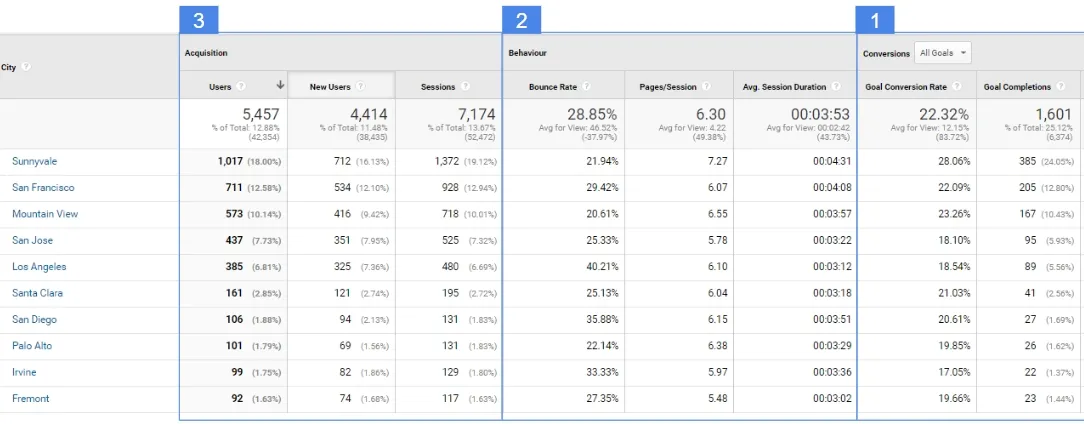 Suppose we have a car dealership in a big city. Most of our clients are residents of this city. Because there are several other smaller towns or cities in our region that do not have a strong dealership representation, we want to reach these locations with our advertising. How should we identify new locations to expand our advertising reach? Should we choose the largest of them in terms of population? We would probably do that if we did not have access to analytical data. What analytical data should we pay attention to in this case? First of all, for conversions (no.1 in the picture above) generated by individual cities. If we want to allocate the advertising budget well, we should choose those cities that have a high conversion rate for the most important goals on our site. If individual locations perform better in organic traffic than others, then there is a high probability that they will also achieve better results in paid activities. We should also focus on engagement (no.2 in the picture above). Locations with a long visit time, a high visit depth and a low bounce rate will determine those locations requiring our attention. Finally, we can look at the volume of traffic (no.3 on the picture above) from specific locations. This will allow us to estimate the magnitude of interest in these places. Having a user profile defined, we can implement campaign optimization in terms of age, gender or interests.