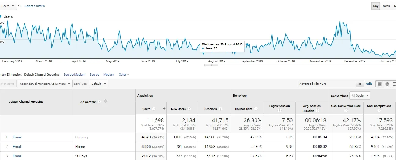 By adding the appropriate tags to each email creation, we are able to check which content has generated the most conversions using the Google Analytics acquisition report. The version of the email campaign (Ad content column) that has the highest conversion rate will be the one you want to resend.